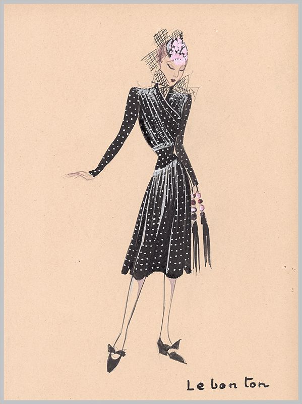 Копия «Тёмное шёлковое платье в белый горошек и шляпка Le bon ton из коллекции осень-зима 1942-43 года парижского дизайнера Мари-Луиз Брюйер (собственноручная гуашь автора). Уникальный документ истории моды времен Второй мировой войны»